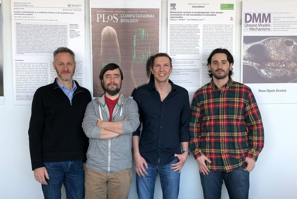 ”Părinții” Xenoboților: (stânga spre dreapta): Josh Bongard de la Universitatea Vermont; Michael Levin de la Universitatea Tufts și Institutul Wyss a Universității Harvard; Douglas Blackiston de la Universitatea Tufts; și Sam Kriegman de la Universitatea Tufts și Institutul Wyss a Universității Harvard. Imagine: Universitatea Tufts