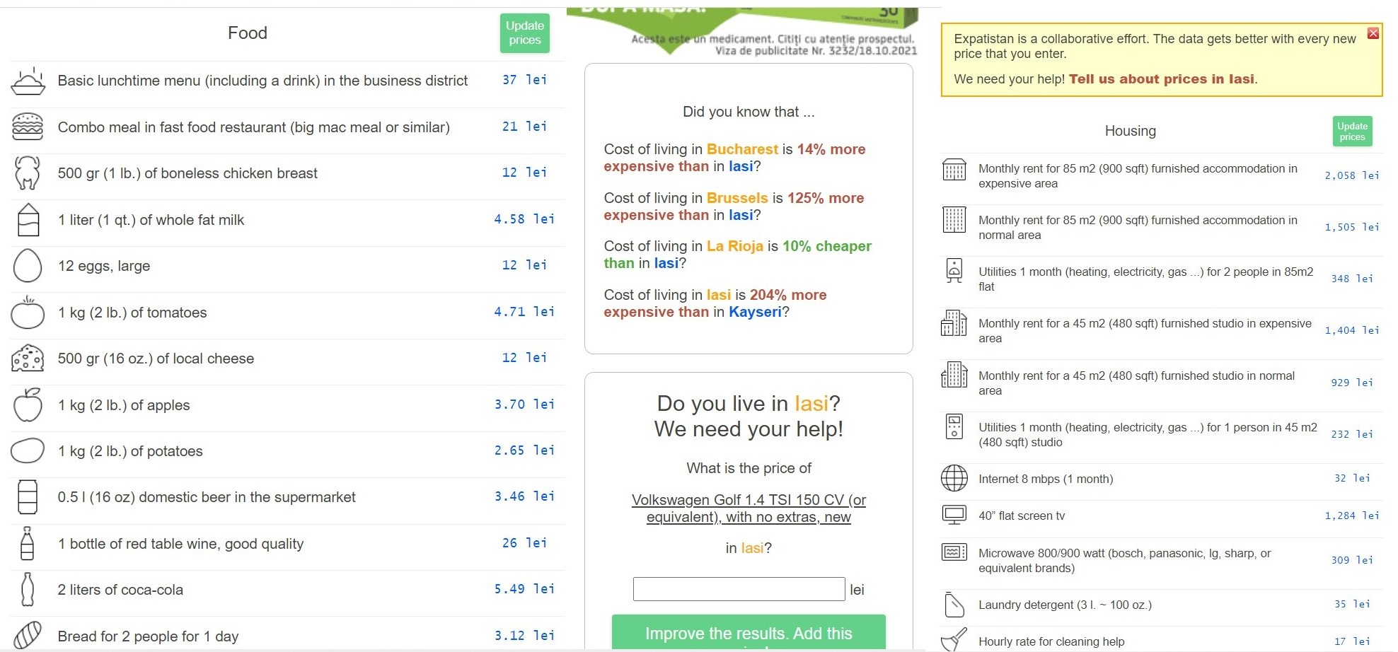 Prețurile medii în Iași. Montaj NewsCafe via Expatistan.com