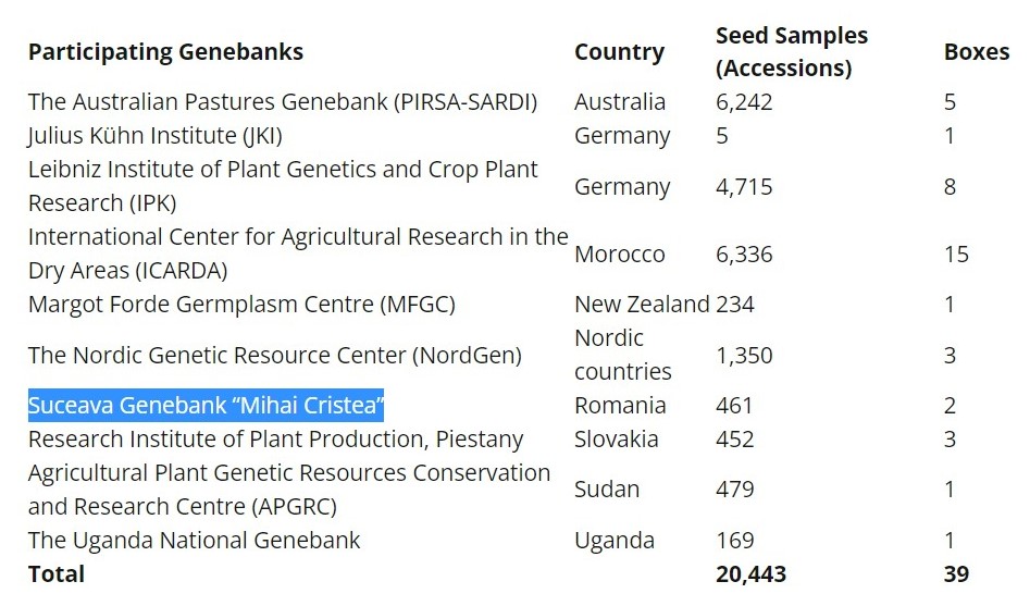 Pe portalul tehnic al criptei, SeedVault, am găsit că România păstrează peste 2.300 de mostre de semințe dintr-o varietate de plante, inclusiv floarea-soarelui, tomate, porumb, mazăre, fasole, năut, soia, grâu comun, ovăz, orz, muștar, lucernă, șofrănel, lucernă, trifoi, linte, eutopia, vârtejul pământului, golomăț, coroniște, etc.