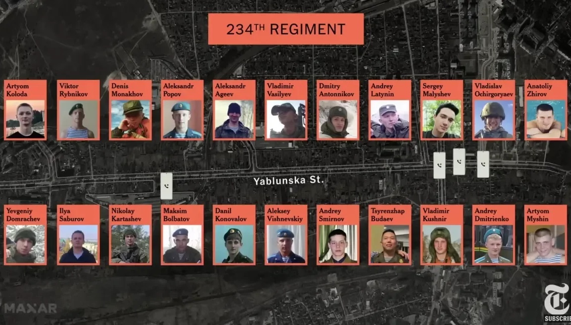 Deși în perioada când au fost comise crimele în oraș se aflau diferite unități militare rusești, anume regimentul 234 este numit drept responsabilul principal pentru moartea a circa 40 de civili în strada Iablunska, au precizat autorii investigației. Parașutiștii din Pskov au lăsat în urma lor tehnică blindată cu insigne militare, uniforme, echipamente de comunicare și acte de marcat pe lăzile cu muniție.