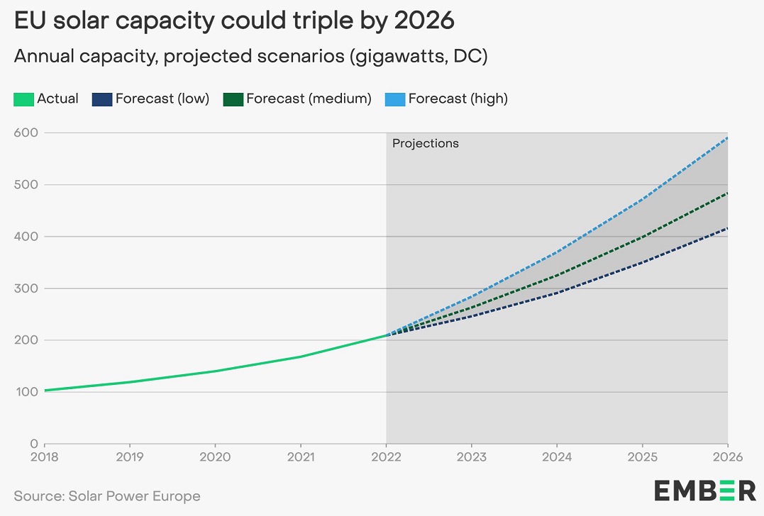 Cele mai mari creșteri au fost înregistrate la instalații solare – plus aproape 100% în comparație cu anul precedent – și până în 2026 se va majora până la peste 400 gigawatts, potrivit scenariului prost, adică dublu față de anul trecut. Țările UE care au demonstrat cea mai bună performanță sunt Germania, Spania, Polonia, Olanda și Franța.