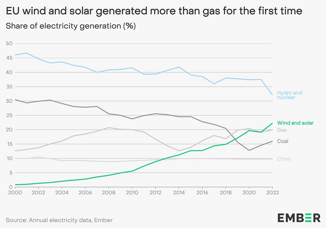 Această concluzie se desprinde dintr-un raport al organizației Ember, un think-tank nonprofit cu sediul la Londra, care notează că, în anul 2022, energia solară și eoliană au generat 22% din electricitatea produsă în UE. Este un volum record, care depășește volumul de curent generat de gazele naturale – 20%.