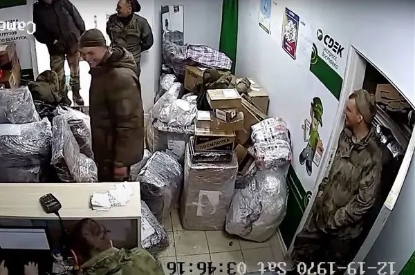 Russian soldiers at a post office sending home stolen items. Credit: Hanna Lyubakova