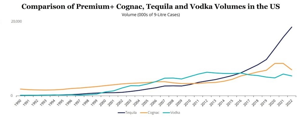 IWSR's market and consumer data report indicates that cognac's performance in the U.S. may also be affected by increased competition from agave-based spirits, especially as tequila is pushing for entry in the category of premium beverage to please high-income consumers. There is an overlapping consumer base, with evidence suggesting that cognac and high-end tequila - a Mexican origin spirit - are vying for the attention of the same consumers.