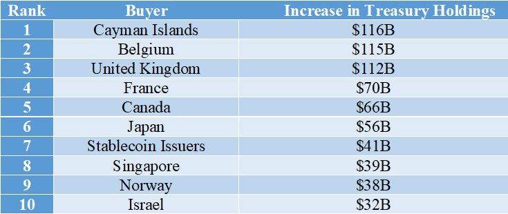 With a $116B increase, the Cayman Islands became the top buyer of U.S. debt. Much of this activity is linked to offshore financial entities and funds registered in the territory.