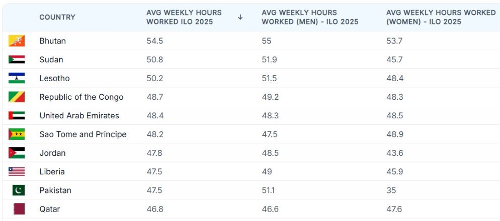 Across more than 180 countries surveyed, African countries — including Sudan (50.8 hours) and Lesotho (50.2) — feature some of the highest global averages, underscoring the link between economic vulnerability and longer working days.