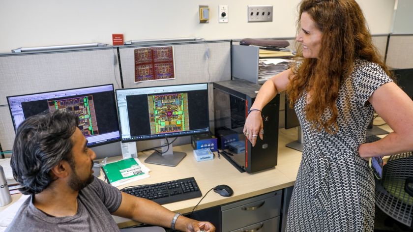 The first-of-its-kind microwave neural network that is fully integrated on a silicon microchip was created by Bal Govind, doctoral student, and Alyssa Apsel, the Ellis L. Phillips Sr. Director of the School of Electrical and Computer Engineering. Credit: Conell University