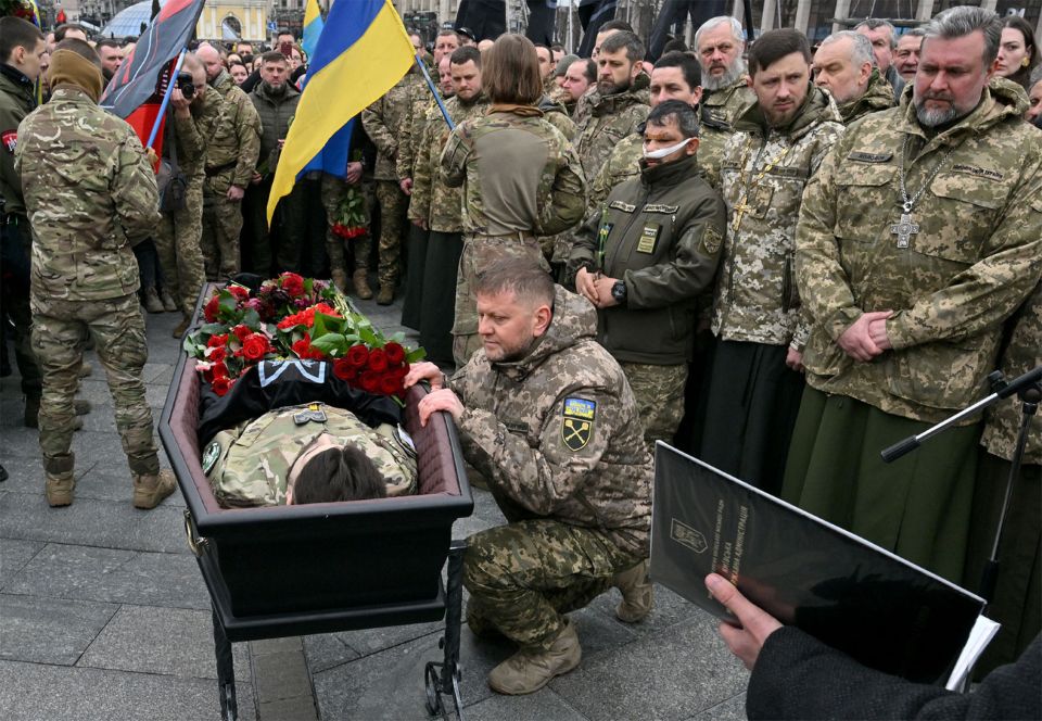 Zaluzhny paying tribute to a Ukrainian soldier fallen on battlefield. Credit: Moscow Times